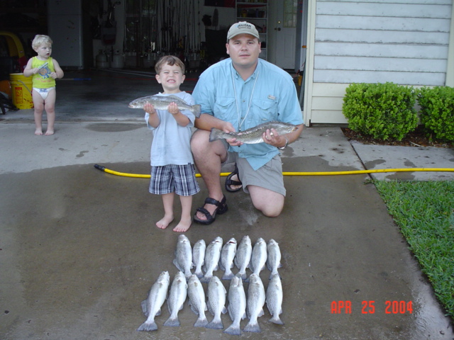 Jon and Edward Mahan with some speckled trout caught by Jon Mahan and Chad Lee in Aransas Bay.